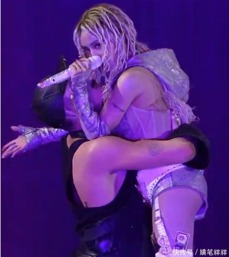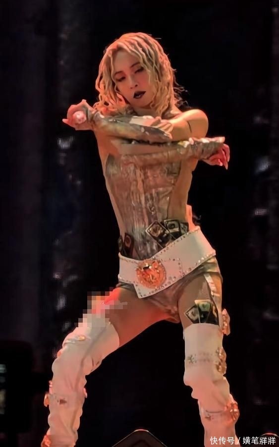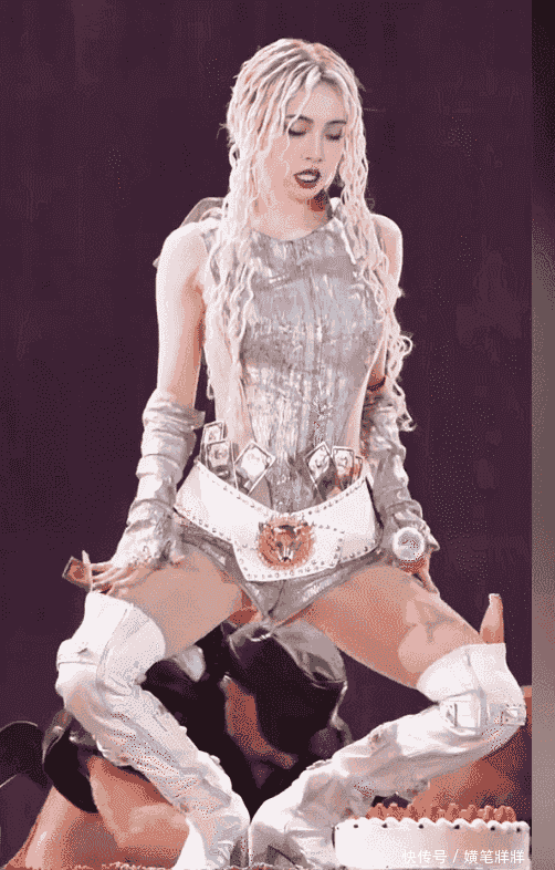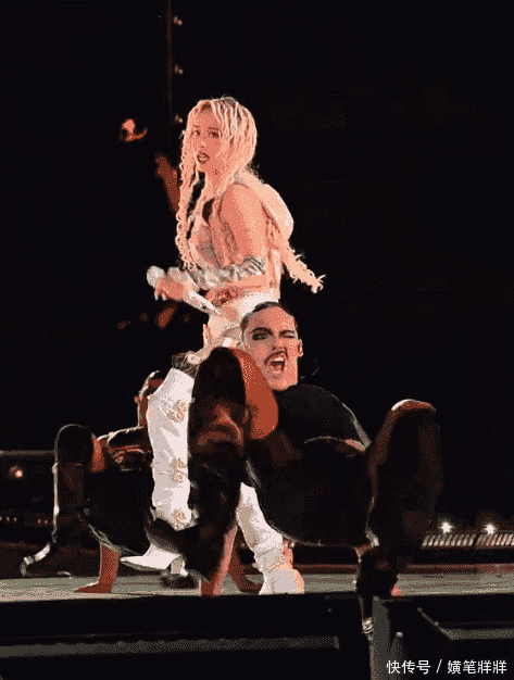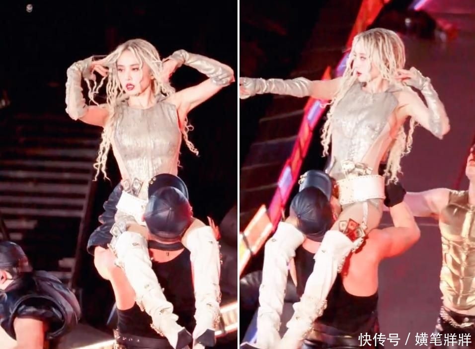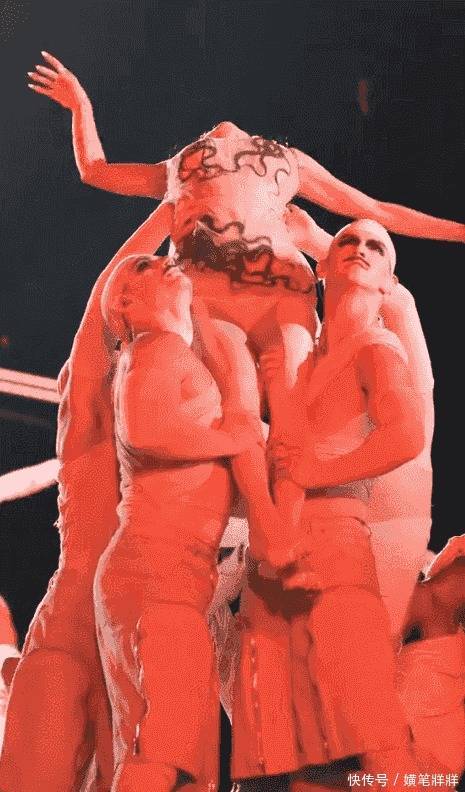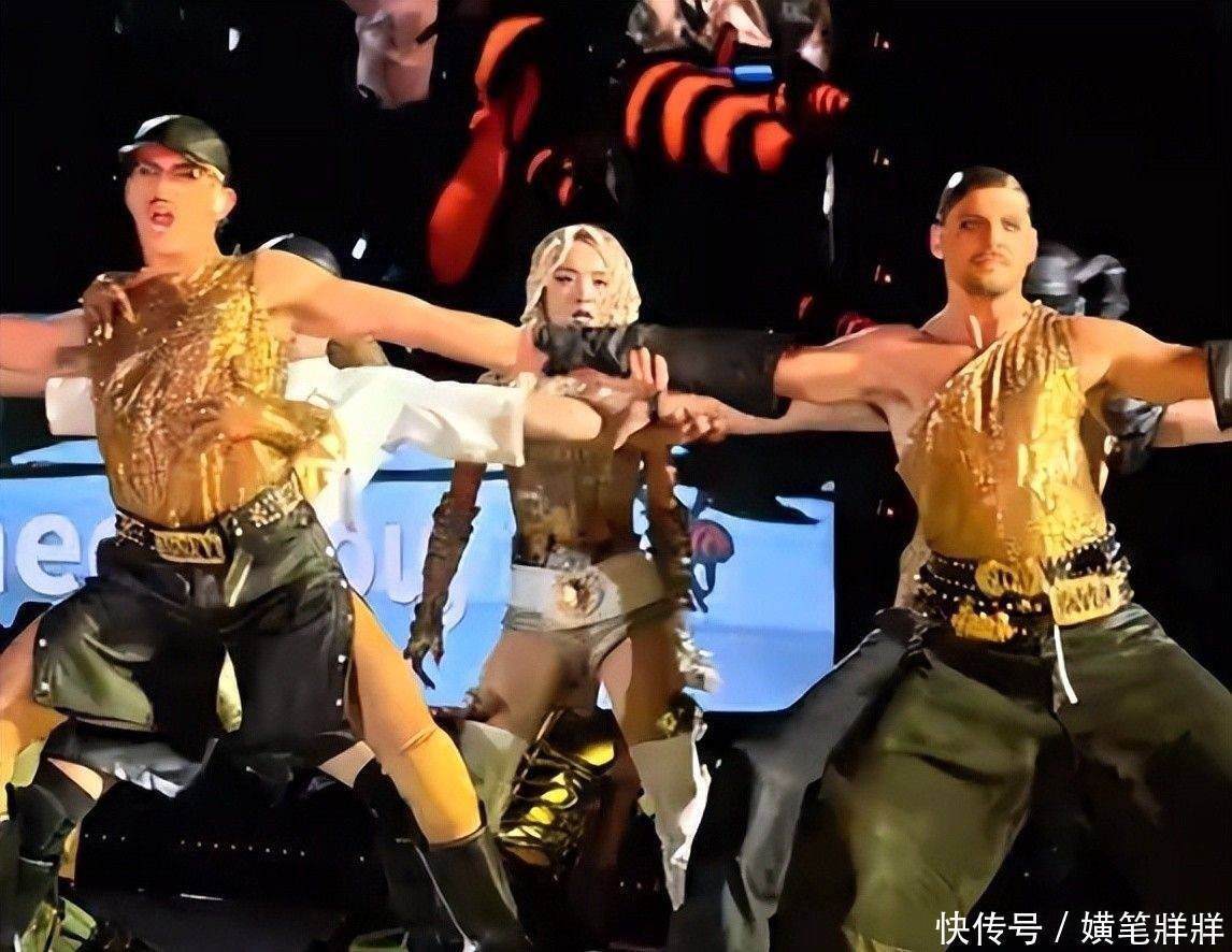 伴舞团队以熊猫眼妆容登场,合力将她托举旋转数圈后缓缓放下,随即在她大腿外侧做出极具暗示性的肢体延展动作。