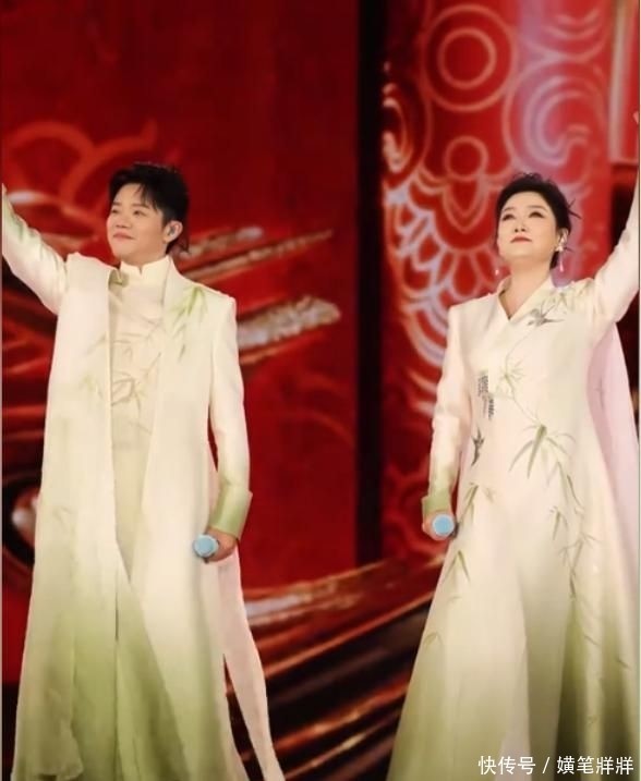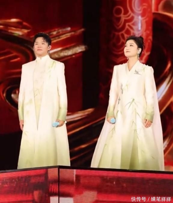 白底渐变青绿的中式立领褂子,衣襟处以工笔竹叶纹样点缀,再配上两人沉稳开阔的台风,整场演出透着一股山河无恙、国运昌隆的庄重大气。